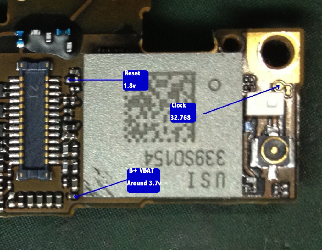 Lets see the schematic below . pin 27 pin28 is VBAT also know as B+, pin12 is reset, pin 47 is Cock , We should test (1) C68_RF B+3.7V (2) R95_RF 1.8v (3) PP13_RF 32.768
